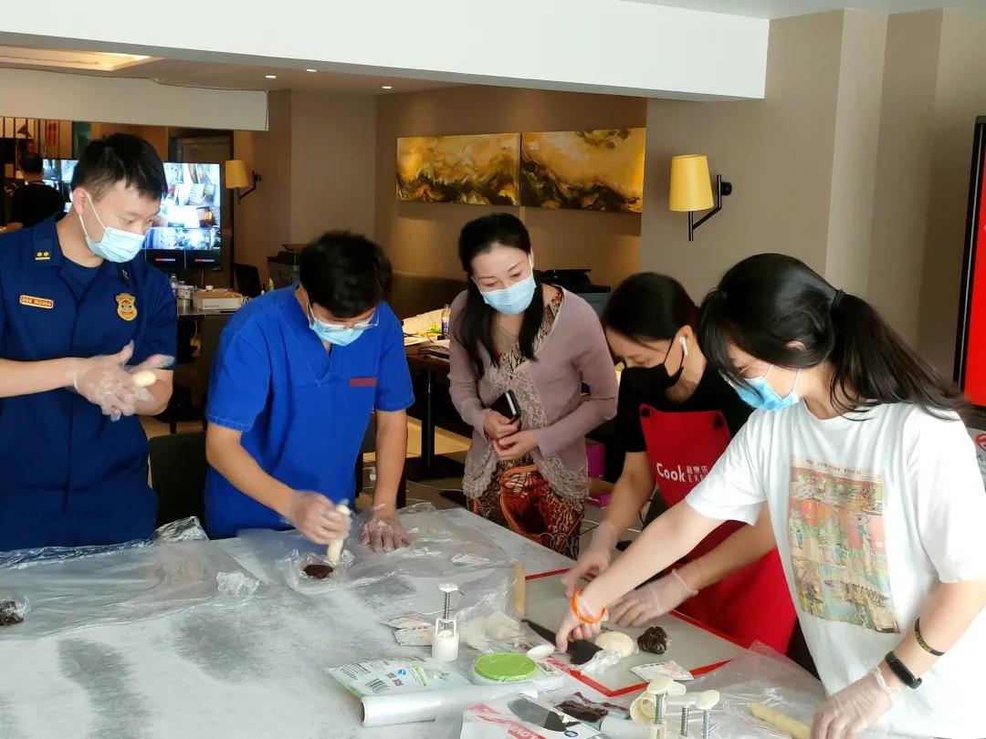 “中秋節他們沒法與家人團聚,我們便想借此營造一些節日氛圍,希望這份手作月餅能為他們的駐守生活增添一份甜意與暖意! 在集中健康觀察點宜川點,一場“宜心守護 感謝有你”的中秋手工月餅制作活動熱烈開展。宜川路街道邀請專業人員指導觀察點的工作人員制作港式冰皮月餅。揉搓之間,一個個散發著香醇氣味的月餅就做好了。