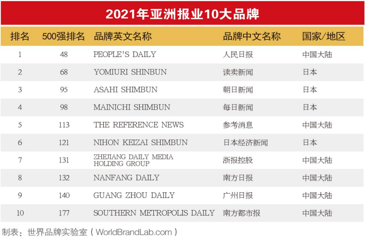 2021年亞洲品牌500強發布 人民日報居亞洲報業品牌榜首