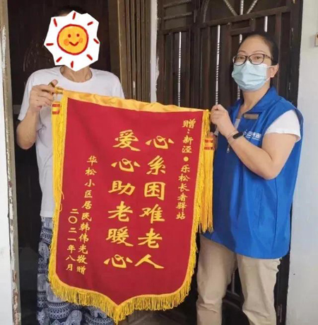 家住新涇鎮華松小區的韓老伯近日特意制作了一面錦旗,送給新涇·樂松長者驛站的工作人員!靶南道щy老人 愛心助老暖心”,錦旗上樸素的文字流露出老人的感激之情。
