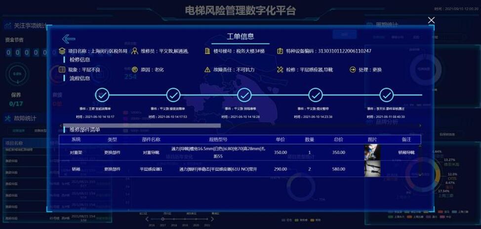 “稅務大樓3號梯故障,出現平層不良現象……”,點開一張物業報修的維修工單,電梯設備編碼、樓號梯號,維修流程等信息一目了然。14:10:17,物業經理發起故障單;14:18:28,維修人員掃碼簽到,到場維修;14:23:38,維修人員提交并開出更換部件清單……僅僅幾分鐘,維修人員就回應了物業需求,厘清了電梯故障。