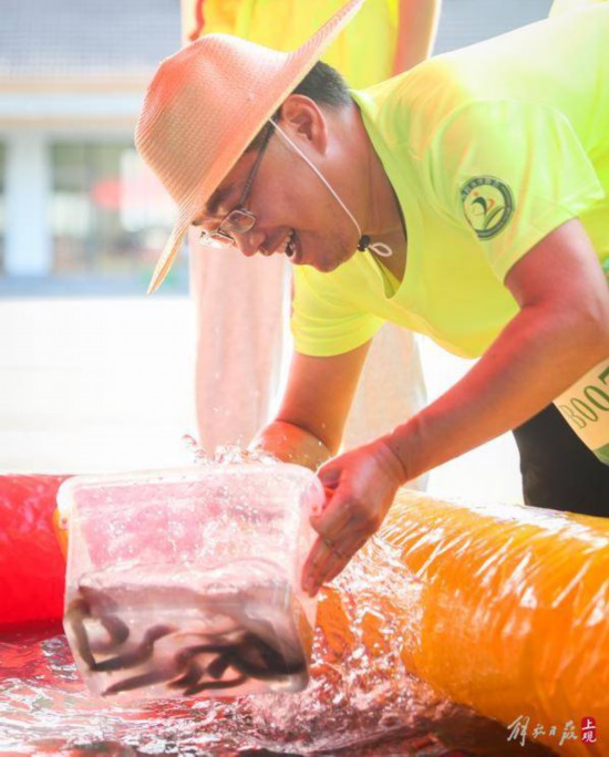“捉泥鰍”看似有趣,其實也是一門技術活,小小的泥鰍經常一不留神就從手中滑落,賽場中的選手們爭先恐后,賽場邊的啦啦隊熱火朝天。