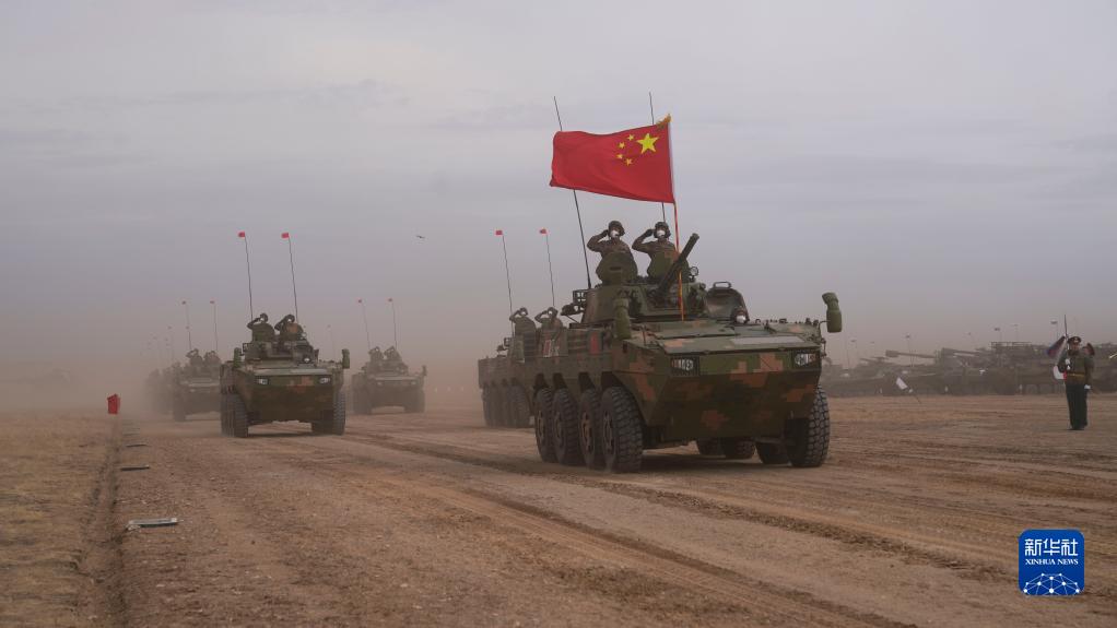 9月24日,在俄羅斯奧倫堡州東古茲靶場舉行的“和平使命-2021”上海合作組織聯合反恐軍事演習閉幕式上,中方參演部隊裝備方隊接受檢閱。新華社記者梅世雄攝