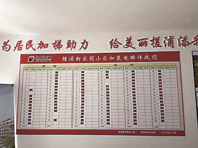 槎浦新家園專項加梯工作室可以算得上是其中一個典型。工作室由槎浦新家園與徐虎加梯工作室人員共同組建。工作室外的門窗上,張貼著多張加梯海報,營造了濃厚的宣傳氛圍。進入室內,碩大的小區加裝電梯作戰圖映入眼簾,清晰地反映出當前加梯工作的實時進度。作戰圖旁,張貼著兩套不同加梯方案的效果圖。對面一側的墻上,小區的加梯地圖以不同顏色的色塊將所有樓棟按照難度進行劃分,十分醒目。同時,重點樓道加梯工作架構圖、槎浦新家園加梯工作小組名單等信息一目了然,整個辦公場所采取“可視化”模式,所有信息均“透明化”。