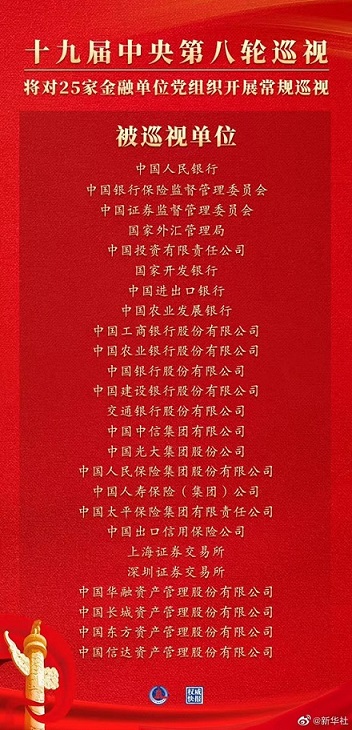 新華社北京9月26日電 經黨中央批準,十九屆中央第八輪巡視將對中國人民銀行、中國銀行保險監督管理委員會、中國證券監督管理委員會、國家外匯管理局、中國投資有限責任公司、國家開發銀行、中國進出口銀行、中國農業發展銀行、中國工商銀行股份有限公司、中國農業銀行股份有限公司、中國銀行股份有限公司、中國建設銀行股份有限公司、交通銀行股份有限公司、中國中信集團有限公司、中國光大集團股份公司、中國人民保險集團股份有限公司、中國人壽保險(集團)公司、中國太平保險集團有限責任公司、中國出口信用保險公司、上海證券交易所、深圳證券交易所、中國華融資產管理股份有限公司、中國長城資產管理股份有限公司、中國東方資產管理股份有限公司、中國信達資產管理股份有限公司等25家金融單位黨組織開展常規巡視。