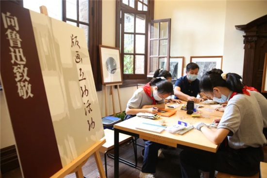 “看!這是魯迅初級中學學生們剛在二樓‘藝苑朝華’社區會客廳版畫互動活動中制作出來的黑白木刻魯迅先生藏書票!”9月25日,在木刻講習所舊址陳列館揭牌儀式上,徐炯、郭芳共同為“木刻講習所舊址”揭牌,并接過了學生們在此新鮮制作的版畫作品,感受紅色文化資源的傳承和發揚。