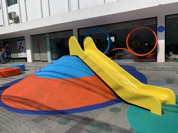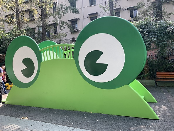 場地上原有的不銹鋼藝術裝置,功能性較差,場地使用率低。結合四平路街道小朋友多的特點,我局會同設計團隊提出了《動物樂園》的改造方案,希望在小場地,呈現大地藝術尺度的作品,一個超級體量的青蛙王子滑梯從大地浮出,露出超大的眼睛環顧四周,熊貓寶寶滑梯也從另一側爬出地面,四處張望,他們好奇地尋找社區的小朋友們,邀他們一起來玩耍。他們龐大的身體似乎掩藏在地下,無形中從視覺效果上拓展了社區空間的尺度想象力。周邊還新配置了多把動物造型的座椅。改造后,該口袋花園成為了周邊小朋友的新寵。