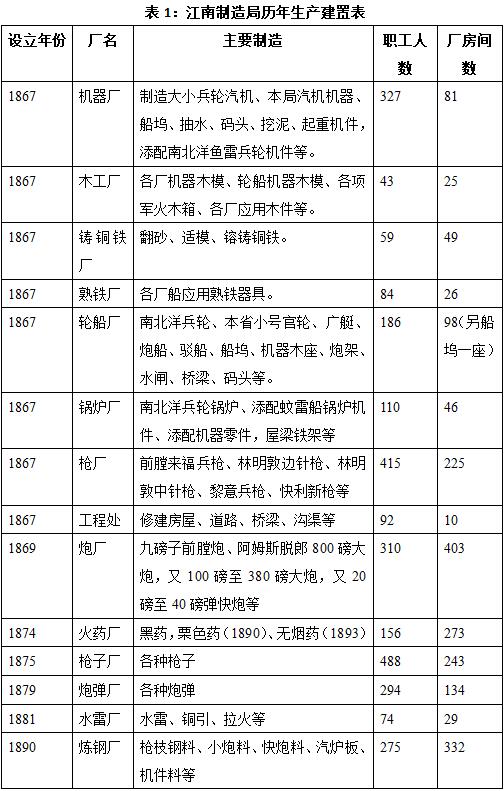 江南制造局除在高昌廟一帶的擴展,又在其它地方設立分廠,火箭分廠建于陳家港,占地五畝。1870年始又于龍華購地八十余畝,建立了制造分局,設立火藥、槍子等廠。江南制造局從創建至1890年的20余年間,已從收買下來的一個中型鐵廠,發展至擁有13個廠和一個工程處的大規模近代軍事企業。其建置過程詳見下表: