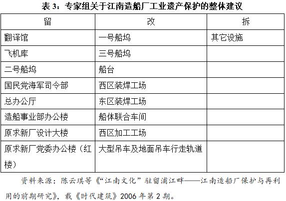 2003年兩會期間,劉慶柱等41名全國政協委員聯名提案,提案強調“江南造船廠的發展史,就是一部中國民族工業史和科技史!薄皬S區內至今保存有各個時期的代表性建筑,如江南機器制造總局初創時期的建筑,建于1872年的船塢,建于1931年的指揮樓和飛機庫、新中國成立初期的廠房以及改革開放后新建的工業建筑等。在調查江南造船廠工業遺產的過程中,無論是企業領導,還是普通員工都對江南造船廠的輝煌歷史充滿自豪!薄坝捎诮显齑瑥S的工業、倉庫設施位于世博會的核心區域,世博會的一些設施將利用現有歷史建筑和工業建筑進行改建。于是,江南造船廠舊址作為我國最重要的工業遺產,其保護問題隨即被提上議事日程!貏e是在城市化進程告訴發展的今天,如何以科學發展觀為指導,妥善處理好工業遺產與城市發展的矛盾,實現工業遺產保護與經濟社會發展的平衡互動與和諧共存,成為擺在城市和企業面前的一個重要課題!碧岚附ㄗh遵循真實性和完整性的原則,整體保護江南造船廠工業遺產;加強對江南造船廠工業遺產的工業考古研究和文獻檔案研究,制定總體保護規劃,對江南造船廠各個時期的代表性工業遺產進行整體、系統的保護,真實、全面地保存江南造船廠工業遺產的歷史信息及突出價值,盡快開展全國重點文物保護單位的申報工作;著手建設中國工業博物館和大型工業遺址公園,突出江南造船廠工業遺產的社會教育功能,將其建設成為世界水平的工業遺產博物館和弘揚民族精神的愛國主義教育基地。2004年5月《現代城市研究》雜志上首先發表了深圳大學研究生唐修俊呼吁保護和利用江南造船廠工業建筑的文章,后來又發表了劉會遠教授同樣主題的六篇文章,從學者的角度為江南造船廠的保護和利用提供了對策、引起輿論的關注。同濟大學鄭時齡院士指出,位于浦西的世博會選址規劃控制區域內大約有十余家工廠企業,是中國近代工業的發源地。在世博會場館建設過程中,一些具有歷史價值和利用價值的工業建筑、船塢和構筑物應該得到有效保護并改造成船舶工業博物館、商業博物館和能源博物館等。