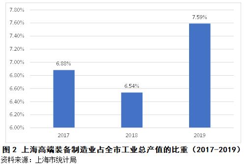 另一方面,上海高端裝備制造業在上海工業中的地位逐年上升(圖2)。上海高端裝備制造業生產規模擴大的同時,行業占全市工業總產值的比重也呈不斷上升的趨勢,所占比重從2017年的6.88%,上升至2019年的7.59%。隨著上海智能制造裝備、船舶和海工裝備、航空裝備、以及軌道交通裝備等產業的不斷快速發展,上海高端裝備制造在上海工業制造業中的作用將會進一步得到提升。