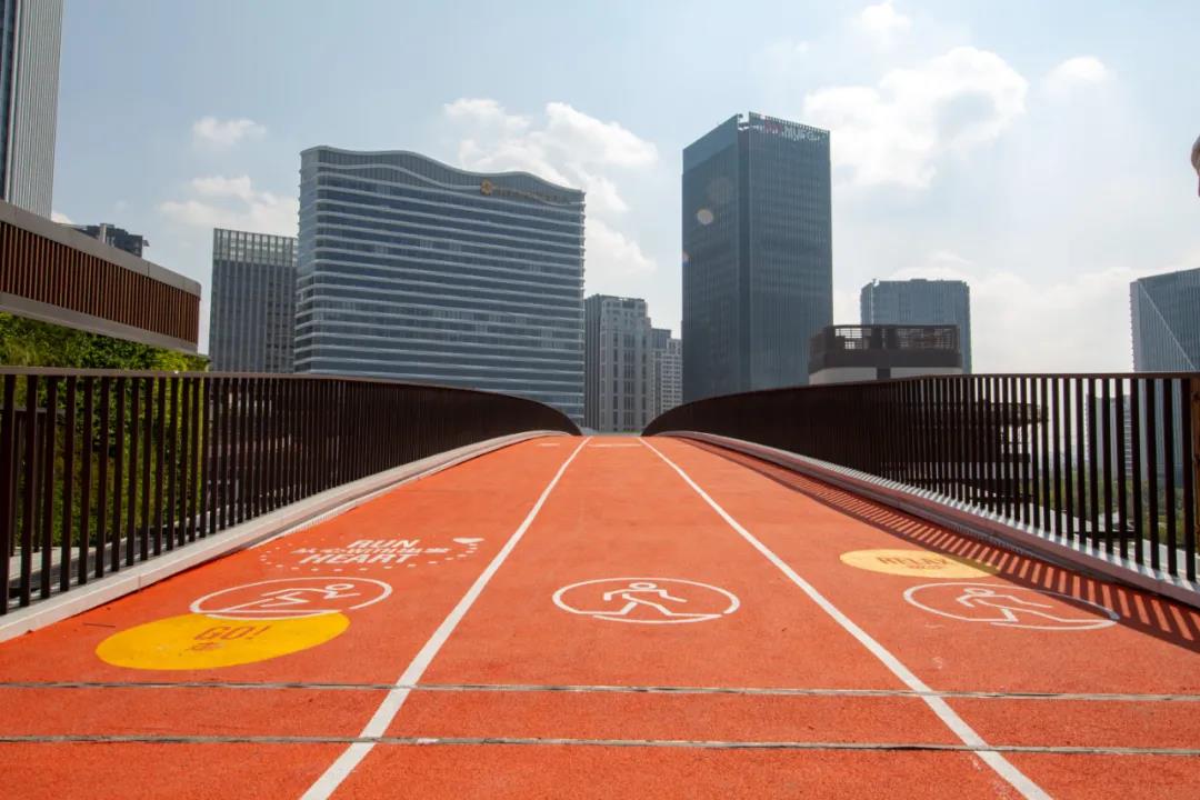 小布在現場看到,Sky Loop天空環道已經亮相4樓,奪目的紅色與藍天白云相映成趣。Sky Loop天空環道全長450米,環繞4樓屋頂一周,由專業跑步道與散步道組成,橫跨前灘太古里南北兩區,串聯起豐富的商業、休閑和景觀,打造屋頂復合社交空間。