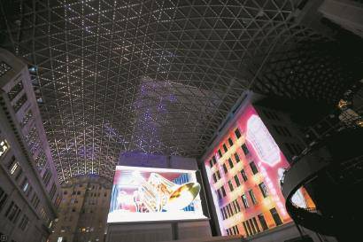據悉,近期將有文創市集、創意巡演、樂隊演出、爵士生活節等眾多精彩紛呈的活動在新開放的外灘中央內庭亮相。記者在現場看到,外灘中央當晚運用內庭獨特的空間優勢,聯動玻璃穹頂、經典老建筑的墻體和炫酷的裸眼3D大屏,呈現了一個多媒體展示的立體空間。