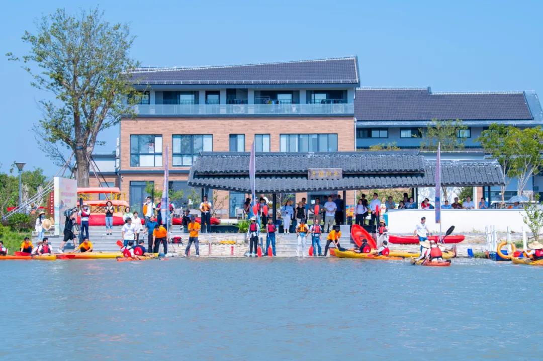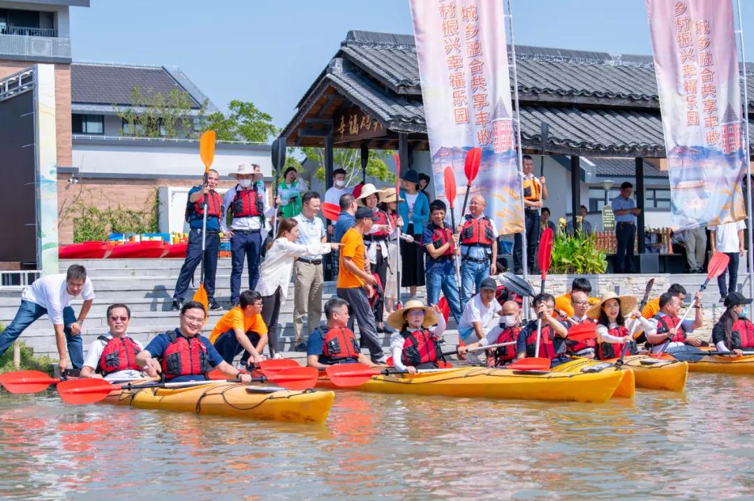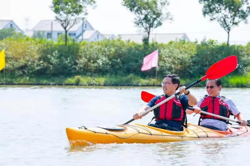 而在碼頭的另外一頭,水上皮劃艇項目也熱火朝天,F場,村民們兩人一組,在漕涇鎮水庫村郊野公園的賽艇上,感受豐收時節兩岸白墻黛瓦的新農村風貌。