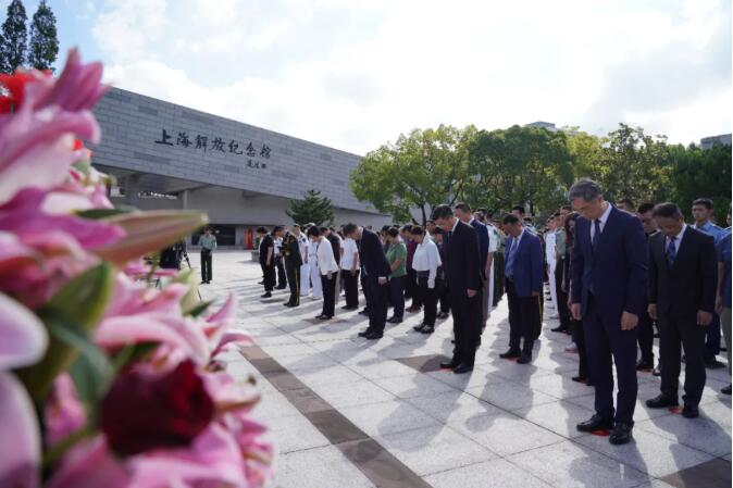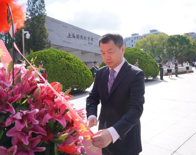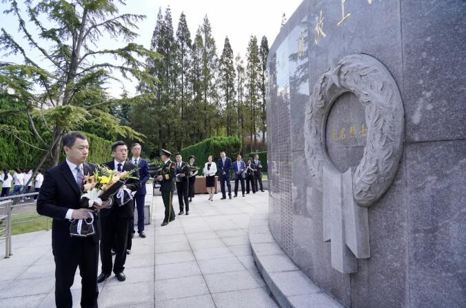 隨后,大家緩步走向革命烈士紀念碑,瞻仰解放上海烈士英名墻,獻上手中的鮮花。