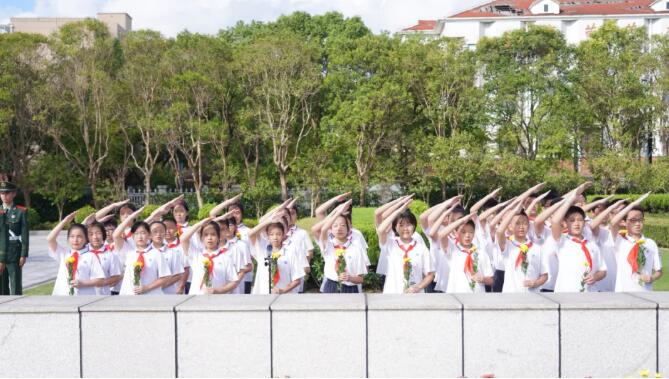 80名少先隊員代表獻唱《我們是共產主義接班人》。伴隨著深沉的《獻花曲》,禮兵向革命烈士紀念碑敬獻寫有“革命烈士永垂不朽”的花籃。