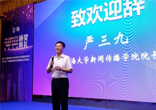 上海大學新聞傳播學院院長嚴三九在會上致歡迎辭。他首先感謝大家長期以來對上海大學新聞傳播學院的關心、支持、幫助和指導,并向所有獲獎作品團隊表示祝賀。他強調,上海大學新聞傳播學院始終緊跟傳媒生態發展前沿,積極搭建平臺為年輕創作者提供揮灑創意的空間,他期待有更多高校參與到“卓越杯”智能媒體作品大賽中來,共同助力新聞傳播人才培養。