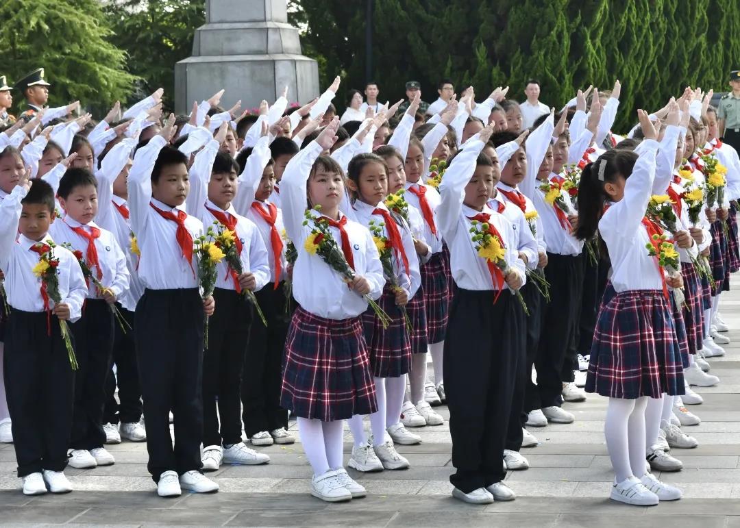 默哀畢,手持鮮花的少先隊員高唱《我們是共產主義接班人》,并致少年先鋒隊隊禮,以嘹亮的歌聲傳承紅色基因。