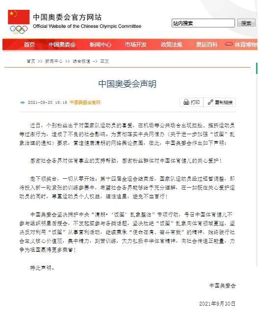 近日,個別粉絲出于對國家隊運動員的喜愛,在機場等公共場合出現拉扯、推擠運動員等過激行為,造成了不良的社會影響。為貫徹落實中央網信辦《關于進一步加強“飯圈”亂象治理的通知》要求,營造健康清朗的網絡輿論氛圍,在此,中國奧委會作出如下聲明: