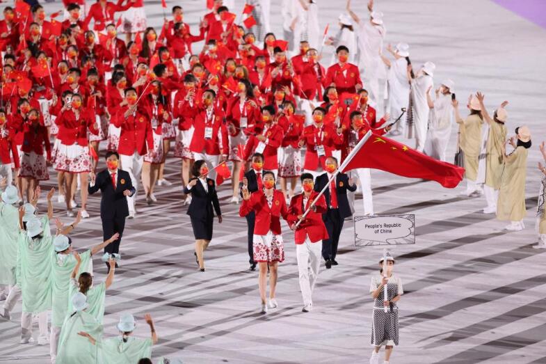 7月23日,第32屆夏季奧林匹克運動會開幕式在日本東京舉行。圖為中國體育代表團入場。新華社記者鄭煥松攝