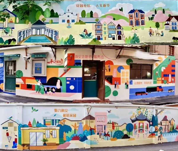 除了樓下的鮮花小徑,今年以來,隨著梅安居民區精品小區改造的完成,小區的路面干凈平整了,綠化井然有序了,戶外照明也安裝到位。最近,小區里還多了一個讓陳阿姨和鄰居們常常掛在嘴邊的地方,那就是小區入口處近100平方米的三面彩繪墻。