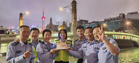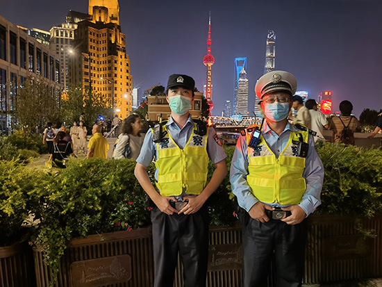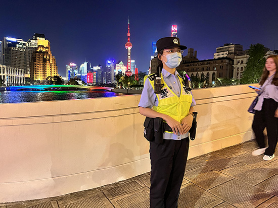 晚上9點,陳曉依收到丈夫發來的微信,正是他站在快艇上在江面值守的照片,不甘示弱的陳曉依也發去了自己在四川路橋頭執勤的工作照。照片里,陳曉依的背后便是黃浦江和陸家嘴的璀璨夜景,她知道,背后的美景有著丈夫和他的戰友守護著,而她的職責就是維持好此時此地的安全有序。