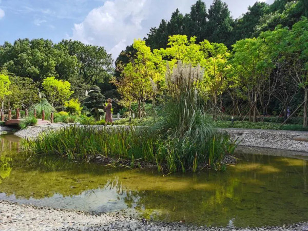 小游園里最著名的景觀就是位于園子中央的生態旱溪。蓄水時,水池與邊上的綠植相映成趣,小橋流水的美景讓人流連忘返;枯水時,水池露出池底白色的鵝卵石,微風輕拂鳶尾,旱溪美景更令人神往。