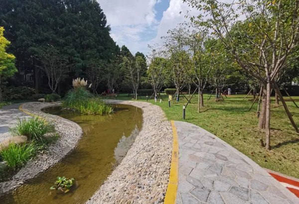 公園內環形水域、親水平臺、跨岸拱橋的設計為居民創造了多處休閑空間,木質的廊架別有一番情趣,居民們在此可以休憩賞景。