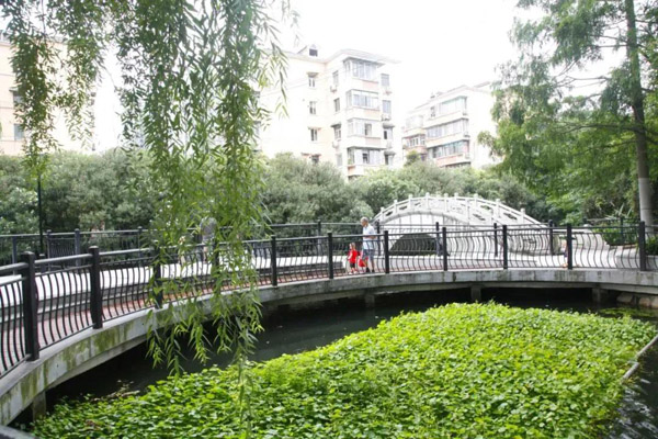 在水城路虹古路交叉路口西北角還有一處街心公園——伊水園,公園緊鄰天然河道周家浜,亭亭玉立,在水一方。