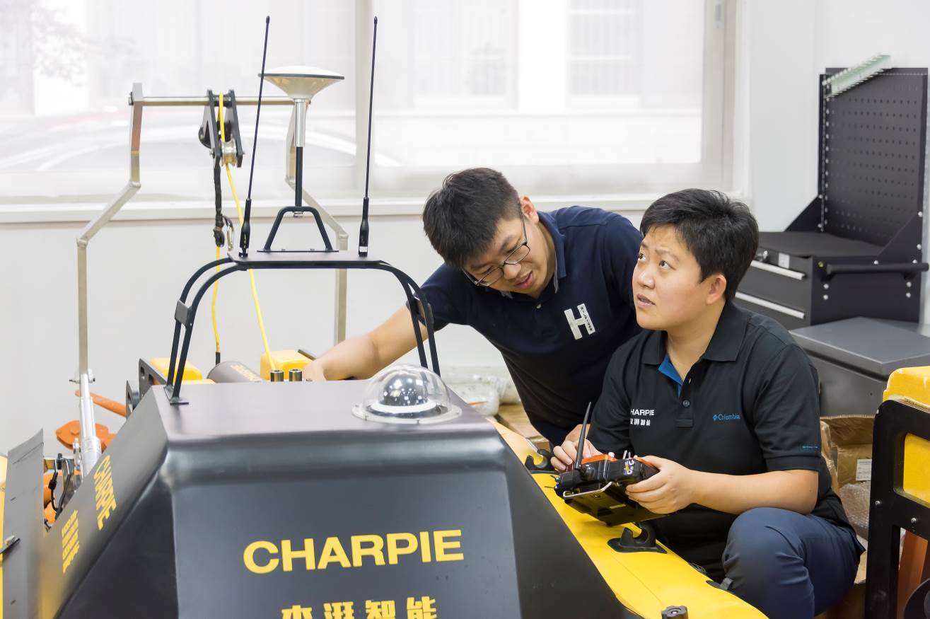 上海張江科學城服務主戰場,科研人員付斌(右)和同事調試水下機器人遠程通訊系統,馳援抗洪一線(資料照片)。新華社發