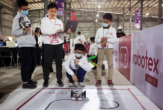 2021年5月2日,第二十屆robotex世界機器人大會中國總決賽在上海寶山智慧灣科創園舉行。圖為青少年選手在樂高循線比賽前進行調試。王愚寧攝