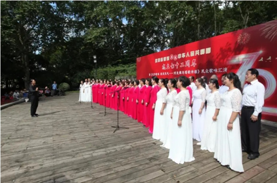 詩文朗誦、越劇歌舞……今年國慶節,魯迅公園內搭起了以《大聲歌唱 振發民氣——劉良模與國歌傳播》為主題的民眾歌詠舞臺,一個個節目輪替表演,公園內飄出的歌舞之聲,吸引了不少市民群眾循聲圍觀,園內一片歡聲笑語。