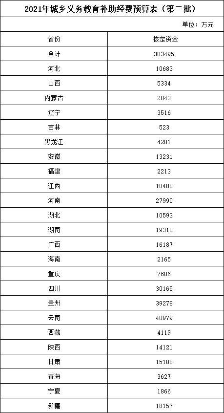2021年城鄉義務教育補助經費預算表(第二批)。來源:財政部網站