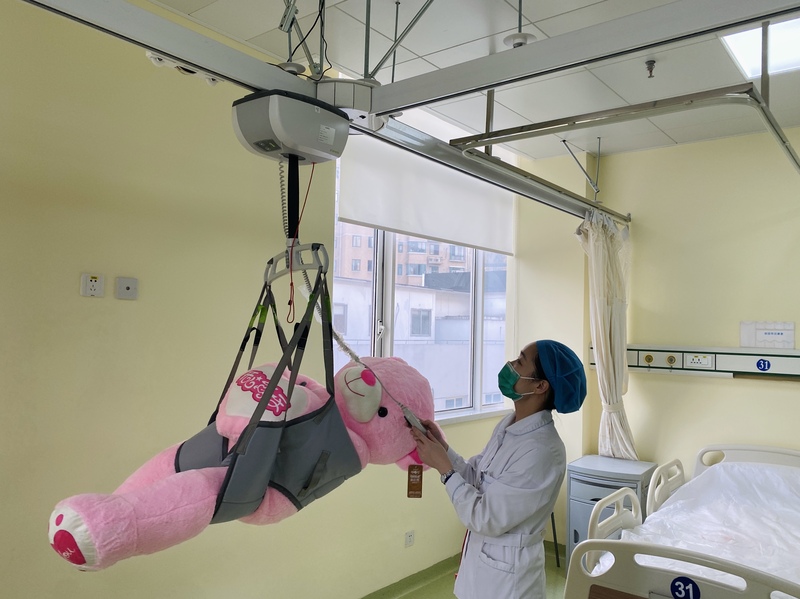 在剛剛建成的康復病房,記者看到天花板垂吊著縱橫交錯的軌道,這就是“天軌”系統。一些下肢失能病人無法自行行走,行動全依賴他人,不僅耗費人力,也打擊了病人的自尊心。而“天軌”系統,可以幫助病人從床上移動到其他地方,方便病人如廁、沐浴,提升臥床病人的生活質量。