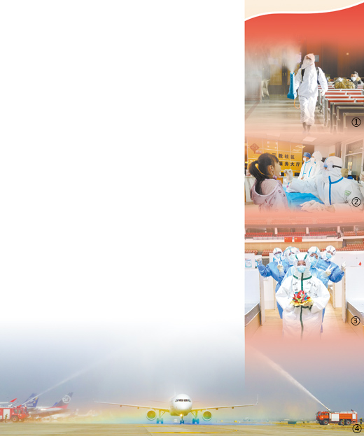 圖④:2020年3月20日,陜西省咸陽機場舉行“過水門”儀式,迎接陜西省第一批援鄂醫療隊凱旋。