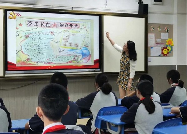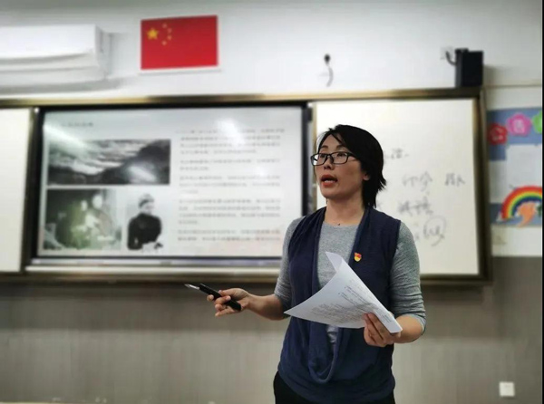 許盈銀是一名語文老師,她在初二(2)班的這節黨課的題目是《弘揚偉大的長征精神》。課堂上,許盈銀從暑期安排學生們閱讀的《紅星照耀中國》說起,結合大家專題探究后做的以“長征”為主題的閱讀小報,開始了整節課程。