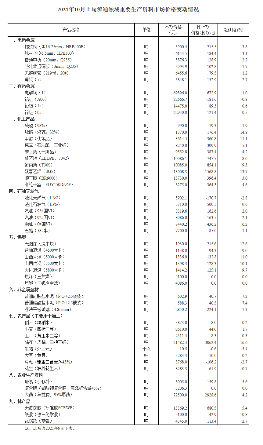 人民網北京10月14日電 (申佳平 實習生許愿)國家統計局官網消息,據對全國流通領域9大類50種重要生產資料市場價格的監測顯示,2021年10月上旬與9月下旬相比,37種產品價格上漲,10種下降,3種持平。