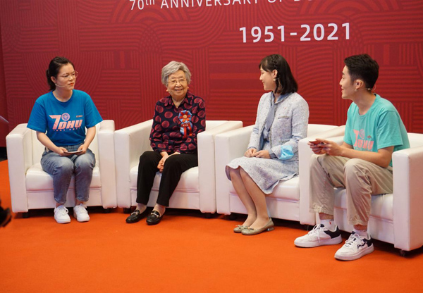 此外,學校開展長達13小時的校慶全天候直播,外景主持人走進上海紡織服飾博物館、校史館、科技館、教育成果展等,帶領校友云游校園,讓每一位東華人無論身在何處,都能“零距離”感受校慶的熱烈氛圍,共同慶祝母校70周歲生日。