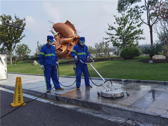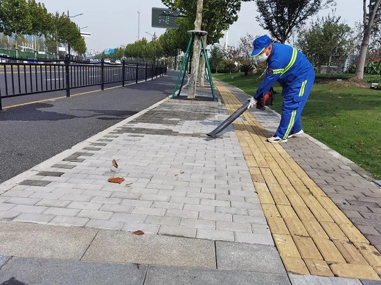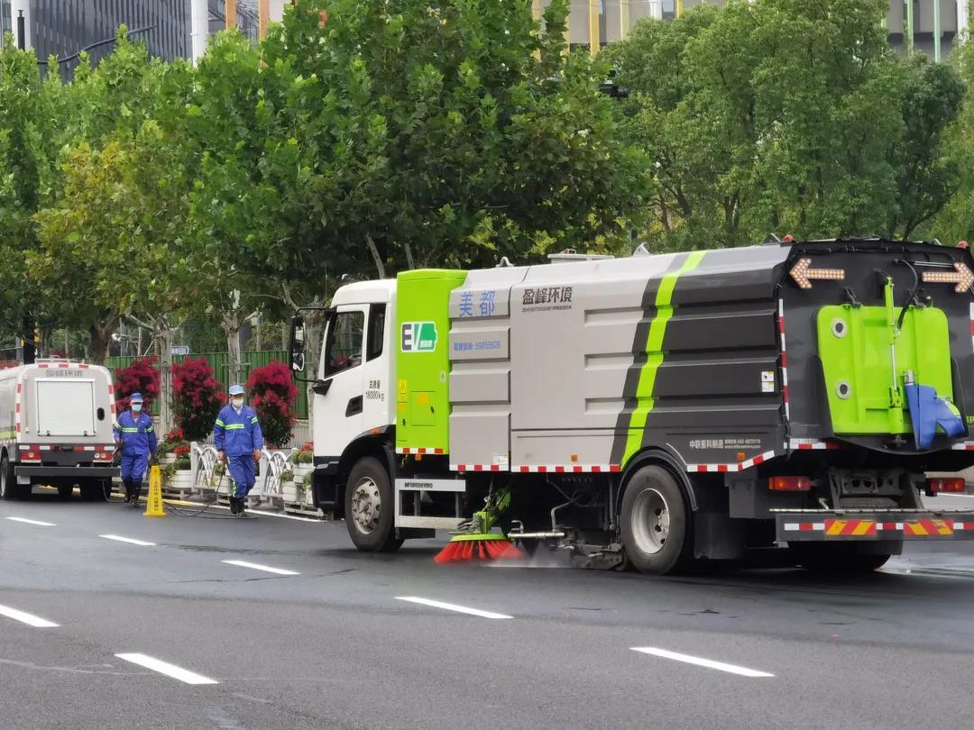 在國家會展中心1號門前的盈港東路上,環衛保潔員正在開展道路保潔“七步法”作業。首先,保潔員利用斜背式吹風機將人行道上的樹葉進行吹掃,集中后收進垃圾桶;第二步,對于路面出現污漬影響美觀的區域,保潔員利用路面養護車進行高壓水重點清洗,讓路面露出“本色”,發現泥土堵塞的排水口和窨井口,高壓水也可以進行疏通;第三步,保潔員駕駛高壓清洗車將主干道路面的小碎石及垃圾沖至道路兩側;第四步,保潔員駕駛掃路車對主干道的粉塵、固體廢棄物等垃圾快速清掃干凈,避免垃圾粘附地面;第五步,保潔員使用路面養護車的多頭沖洗裝置,對溝底進行多方面的沖洗,保持溝底干凈整潔;第六步,保潔員駕駛三合一電動洗掃車,對路面進行清掃、沖洗、抽吸;最后,為保證清掃效果,保潔員會駕駛巡回保潔車實施全天候巡回保潔,確保垃圾滯留時間不超過15分鐘,提升國家會展中心周邊區域精細化保潔水平。