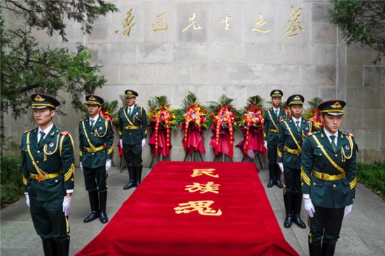 隨后,在莊嚴肅穆的環境中,護旗隊為魯迅先生墓敬獻“民族魂”旗幟。
