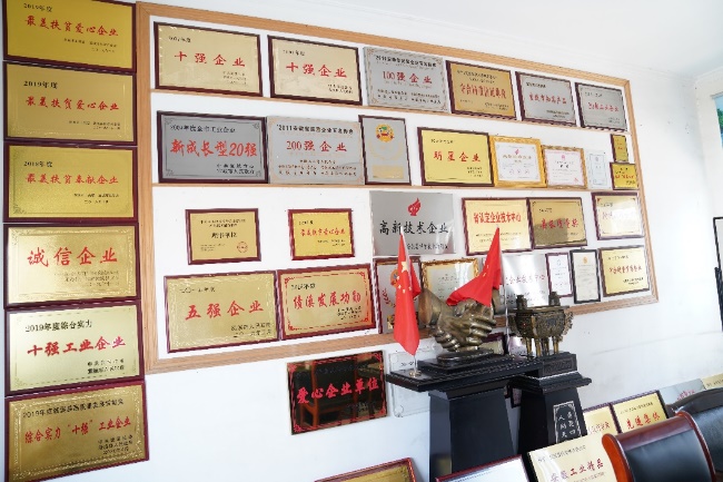 除了對內的“家族式”情感關懷,富凱在社會上廣播愛心的種子,踐行著社會責任。在接受采訪的會議室內有一面“榮譽墻”,其中不乏“最美扶貧愛心企業”、“愛心企業單位”等榮譽證書。這些年來,富凱在公益方面贊助鄉村修路,在扶貧方面以“一企幫一村”的形式結對幫扶周邊的貧困村多年、組織慰問貧困戶,愛心捐助方面在汶川地震和新冠疫情防控中捐款數十萬元,還有贊助學校的各項活動、每年資助貧困大學生數萬元以幫助其完成學業……