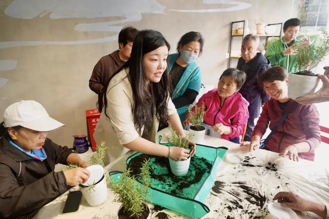 另一邊的慈善超市內,一場小型花藝課正在進行中,幾位社區居民在老師的帶領下親手栽種迷迭香,饒有興致地交流養護心得。