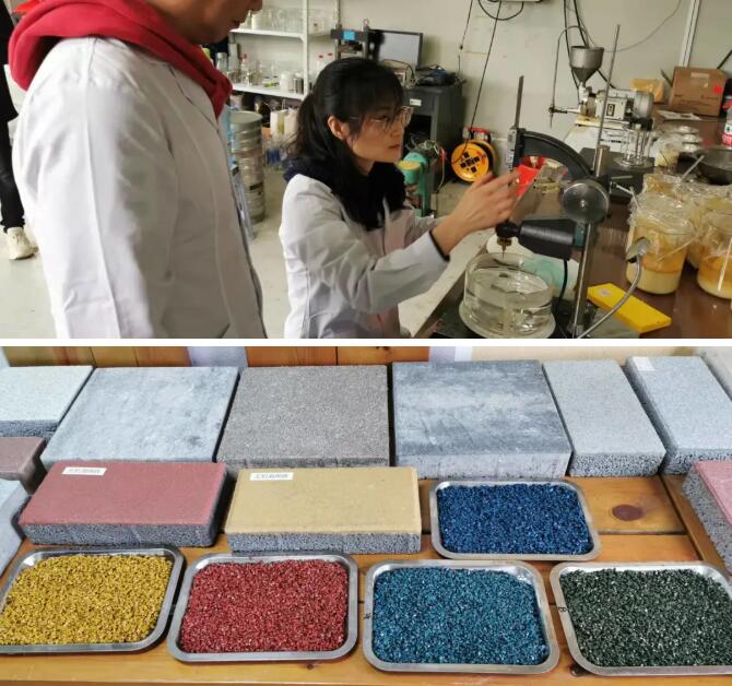 在上海玖鼎環?萍加邢薰镜膶嶒炇依,實驗員們正在測試他們最新研發的產品——綠色低碳彩色透水瀝青。