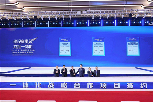 人民網上海10月24日電 10月22日,2021上!ぜ闻d城市推介大會暨嘉興國際投資貿易洽談會在國家會展中心(上海)主會場召開。大會以“建設金南翼 共推一體化”為主題,深入貫徹落實習近平總書記在扎實推進長三角一體化發展座談會上的重要講話精神和省委省政府對共建虹橋國際開放樞紐要求,加快推進長三角一體化發展。活動期間,共有100個項目進行簽約,其中涉及文旅、政務、創新、金融、醫療、教育等30個一體化合作項目和30個產業項目現場簽約。