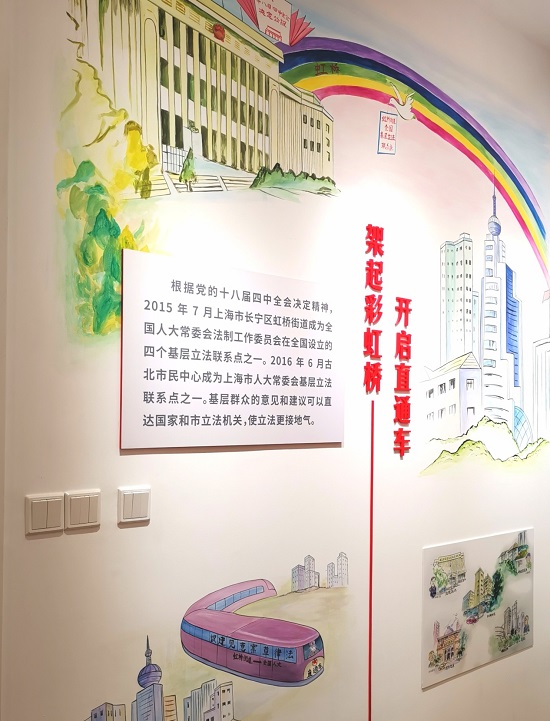 “架起彩虹橋,開啟直通車”,走進上海市長寧區虹橋街道古北市民中心,墻上這組漫畫抓人眼球。