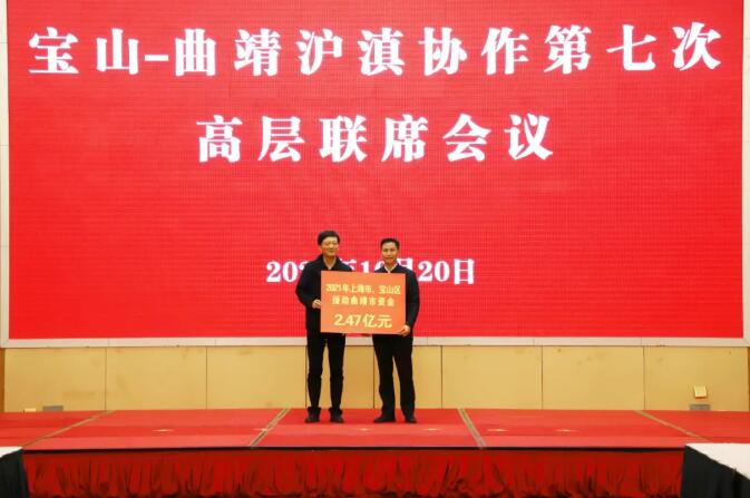 會上,寶山區與宣威市、富源縣、會澤縣、師宗縣、羅平縣簽訂《2021年度東西部協作協議》,區領導丁炯炯代表上海市、寶山區向曲靖市援助2.47億元。
