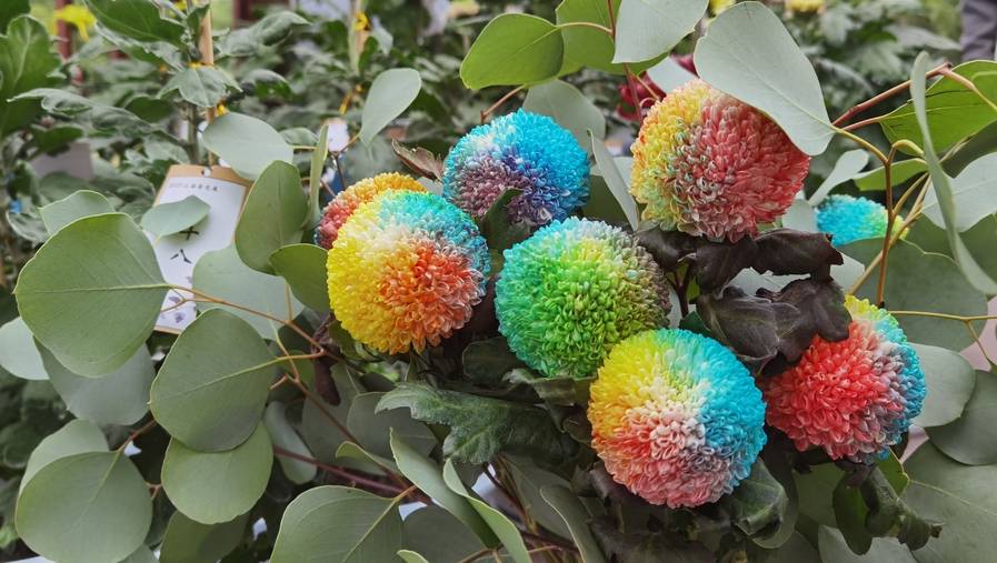一般情況下,乒乓菊有白、黃、粉、綠等顏色,而一朵菊花上同時呈現赤、橙、黃、綠、青、藍、紫七種顏色的,實為罕見。上海共青森林公園園容科專家表示,七彩乒乓菊并非將普通的乒乓菊進行染色后得到,而是通過一套復雜的技術,精準控制溫度、水分、光照、酸堿度等因素,使乒乓菊的根部充分吸收一種叫生物炫彩素的色素,才能將多種色彩均勻地呈現在花瓣上。七彩乒乓菊不僅好看,而且將它養于清水中,保鮮期比一般鮮花長兩到三周。