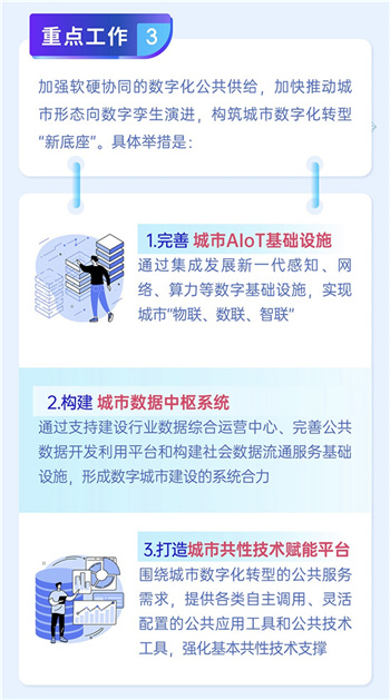 此外,還包括四方面16項具體指標比如,經濟領域,規模以上制造業企業數字化轉型比例達到80%,建設標桿性智能工廠200家;生活領域,打造生活數字化轉型標桿場景100個、數字化轉型示范醫院50個;治理領域,“一網通辦”平臺實際辦件網辦比例達到80%,“高效辦成一件事”“高效處置一件事”標桿場景數量分別達到50個和35個;底座支撐方面,建成物聯感知終端數超過1億個,開放公共數據規模超過15億條。圍繞上述目標,《規劃》提出了“1+3+6”的任務體系。