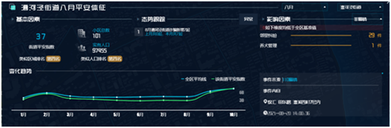 “平安指數”匯集警情、平安事件、糾紛調解、信訪、重點人員、公共安全、輿情、智能安防等8個維度的綜治業務數據,覆蓋范圍包含區、街兩級并穿透至社區。