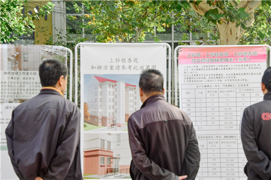 3個小區的實際情況和房型結構各不相同。鎮職能部門、徐虎加梯工作室與居委會、業委會、物業公司一起分小區多次召開居民座談會和聽證會,聽取居民的意見和訴求。銀杏苑小區12-20號5個樓棟由于靠近一個非機動車庫使得加裝電梯的間距不夠。居民代表找到居委會表達了想要加裝電梯的強烈意愿。鎮規建辦和社建辦考慮了小區停放非機動車的實際需求后,對原先的修繕方案進行了優化,將非機動車庫改造后縮小了面積,拓寬了和房屋之間的距離,最終使這5棟樓符合了加裝電梯的條件。像這樣經過反復的修改,修繕與加梯珠聯璧合的定稿方案終于出爐,3個小區符合加梯條件的樓棟也從初稿的60多棟增加到了最終的83棟,真正體現了能加盡加的原則。