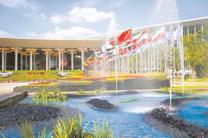 “四葉草”是進博會的核心“舞臺”,本屆進博會以“川流不息·繼往開來”為主題進行綠化景觀的布置。作為“門面擔當”的國家會展中心(上海)南廣場,豎立了8根巨型花柱,直徑1米、高8米,刻有32種“你好”的語言。往前走,是用20種花卉苗木裝點的四個空間,自上而下為“云山”“梯田花!薄昂恿鳌薄艾F代城市花園”,用花量多達96萬盆,讓每一位進入會場的賓客都能感到撲面而來的熱情。