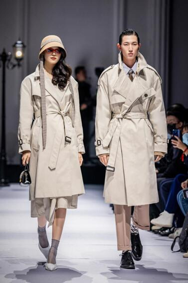 大秀以風衣羽絨服為線索,重現1961年《蒂凡尼早餐》中奧黛麗赫本身穿風衣的英式浪漫,復刻上世紀80年代香港街頭的潮流,再到當代上海CBD的商務通勤風,最后則呈現了未來世界的保暖時尚。四個篇章四幕場景,講述了貫穿半個世紀的時裝發展史。
